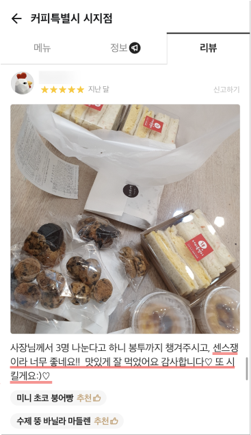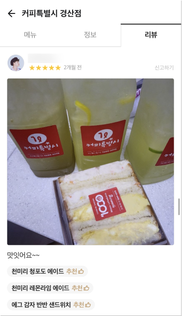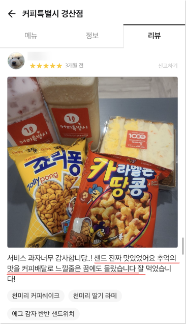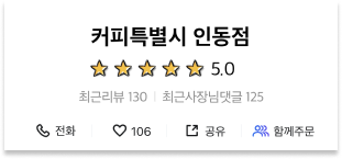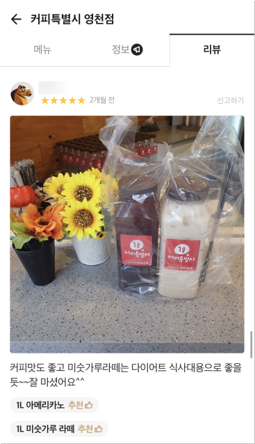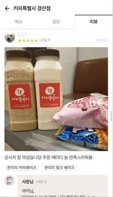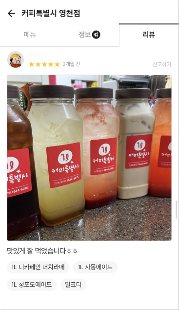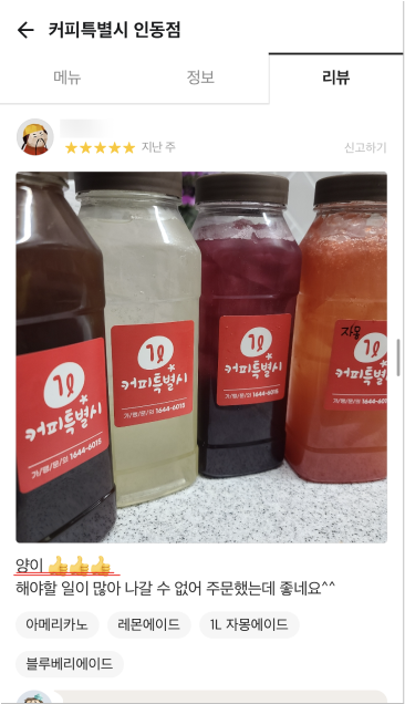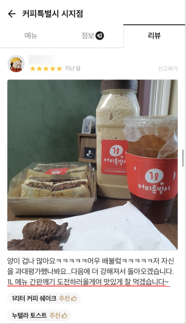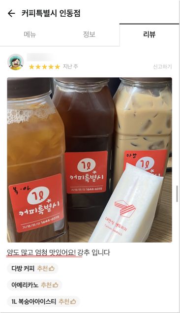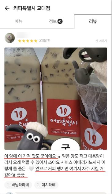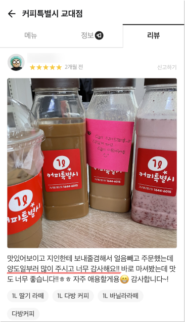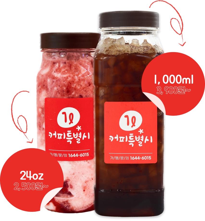거품을 뺀 합리적 가격으로 24oz(매장), 1,000ml(배달) 매장음료와 배달음료 차별화를 두고 위생적이고 샐 걱정없는 1L커피특별시만의 독보적인 배달 용기로 다른 카페와의 차별화