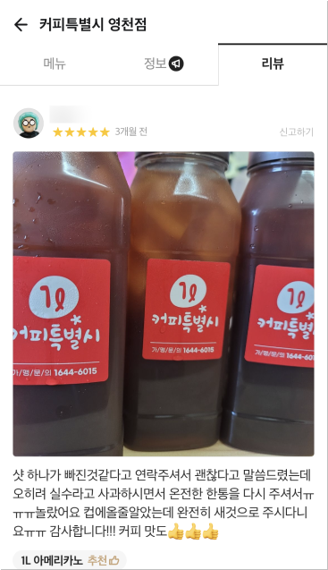 배달 서비스를 위한 샐 걱정없는 1L커피특별시만의 배달 전용 용기를 사용합니다.